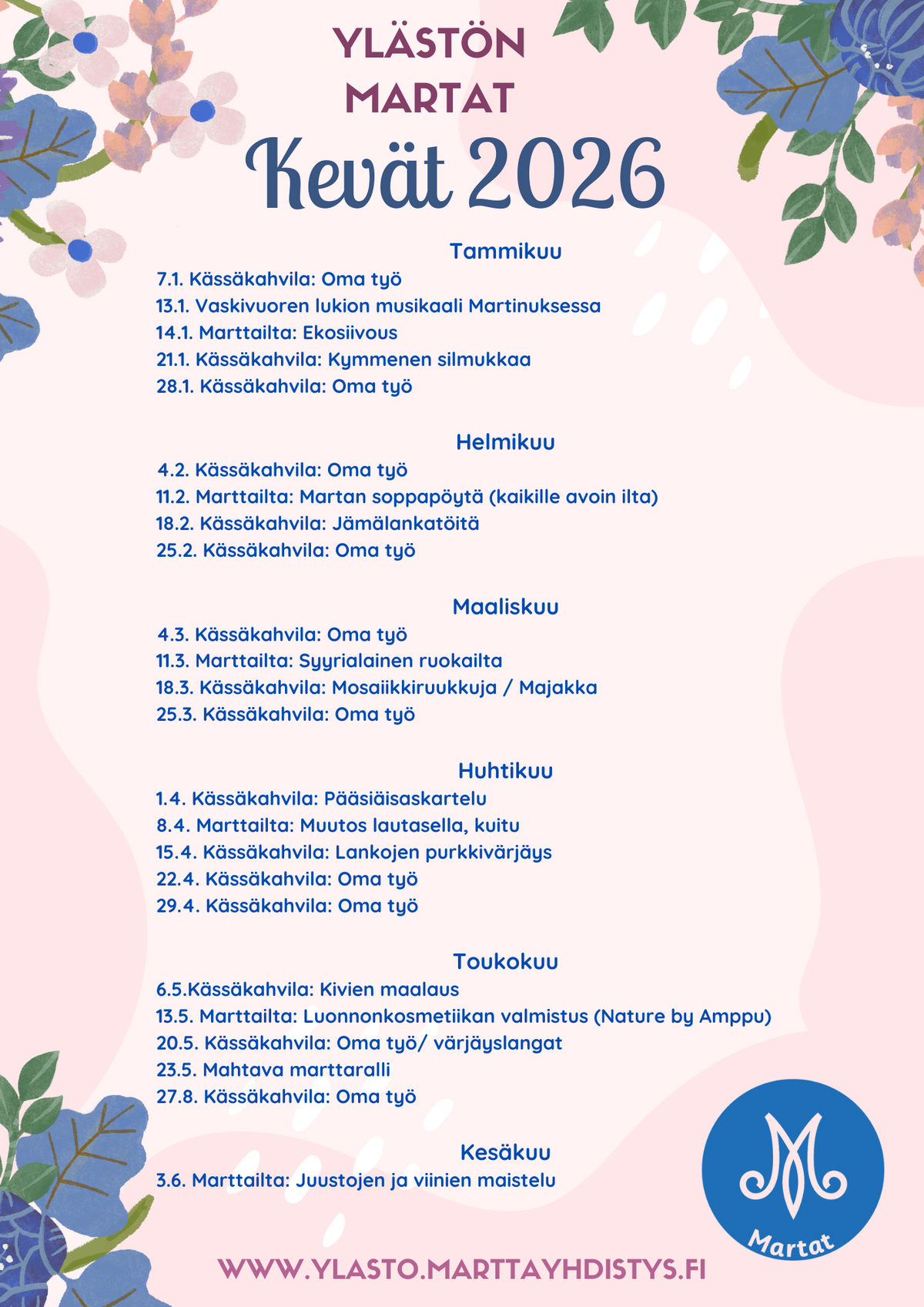 Ylästön Martat toimintakalenteri kevät 2026